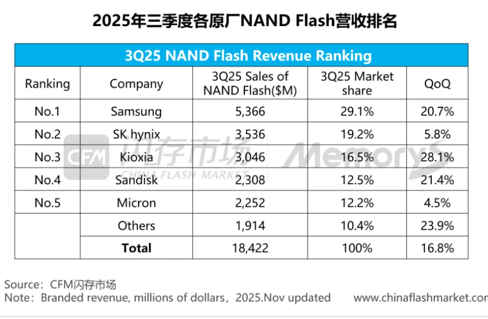 2025年第三季全球NAND Flash市場規模184.22億美元,季增16.8%,年減3.1%,以下為各大記憶體廠的表現: