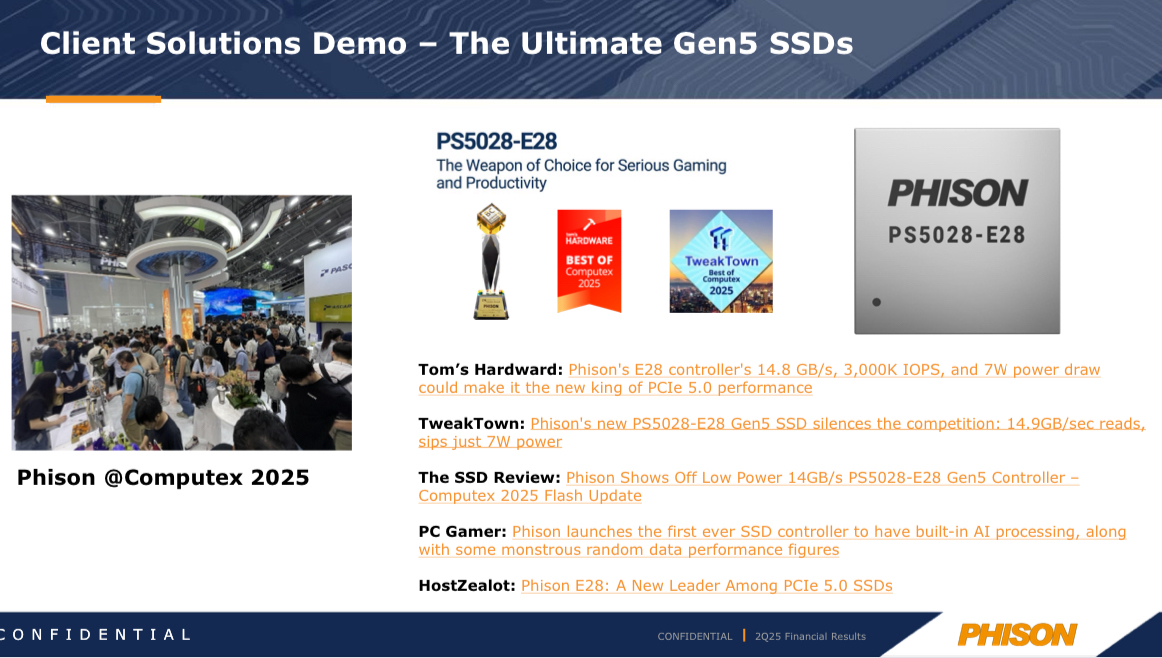 PCIe Gen5方面,群聯的SSD控制晶片已經獲得三家記憶體原廠的訂單,並逐漸向Tier2和Tier3的PC OEM廠商出貨。再者,企業級PCIe 5.0 SSD營收已超越PCIe 4.0,反映伺服器及資料中心對高速儲存的需求提升。