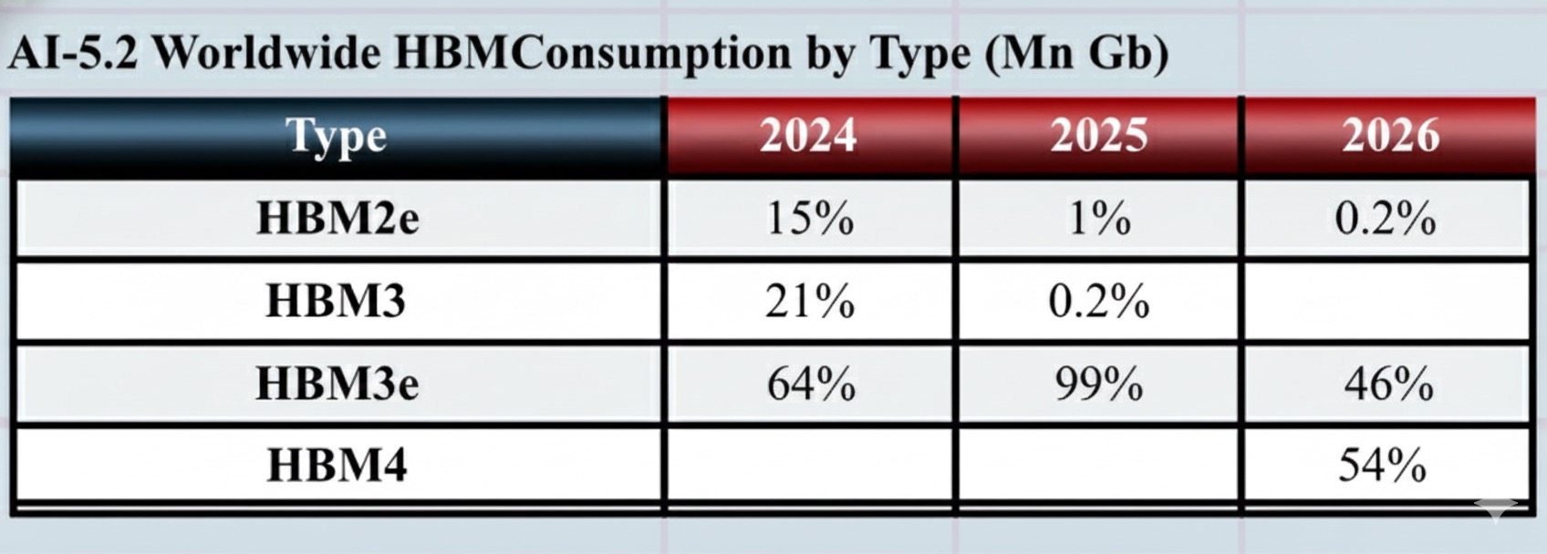 市調機構inSpectrum也從HBM種類來分析,2025年HBM主流為HBM3E,到了2026年HBM3E和HBM4分別佔46%和54%。
